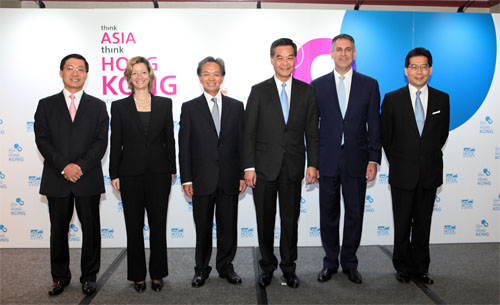图:香港贸发局总裁林天福、美国国务院首席经济师Heidi Crebo-Rediker、香港贸发局主席苏泽光、香港特别行政区行政长官梁振英、美国商务部主管国际贸易事务的副部长Francisco Sánchez,以及香港特别行政区政府商务及经济发展局局长苏锦梁合影