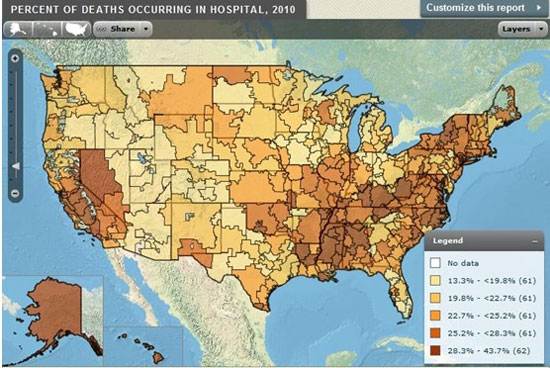 据了解,这个项目的名称叫做“达特茅斯医疗卫生地图集”,是由达特茅斯学院的教授约翰·温伯格(John E. Wennberg)牵头建立。该项目基于全美多年的医疗保险数据,详细记录了二十多年来全美医疗卫生资源的分配和使用情况,可提供覆盖全国、区域、地方、单个医院和医生的综合信息和多种分析结果。在项目的网站(http://www.dartmouthatlas.org/)上,可以找到所有与项目相关的报告和出版物。在网站的专题数据中,提供了诸如慢性病护理、临终关怀、医疗保险报销、医院及医生资源的区域性差异等专题分析。此外,网站还为访问者提供了交互式工具,方便其查看特定区域的情况,或者进行自己感兴趣的对比与分析。