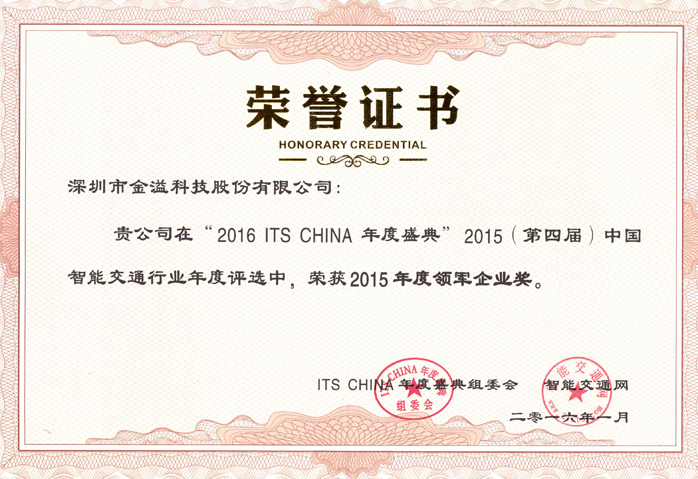 2016年1月15日,在“2016 ITS CHINA年度盛典”2015(第四届)中国智能交通行业年度评选中,深圳市金溢科技股份有限公司(简称:金溢科技)荣获“2015年度领军企业奖”。