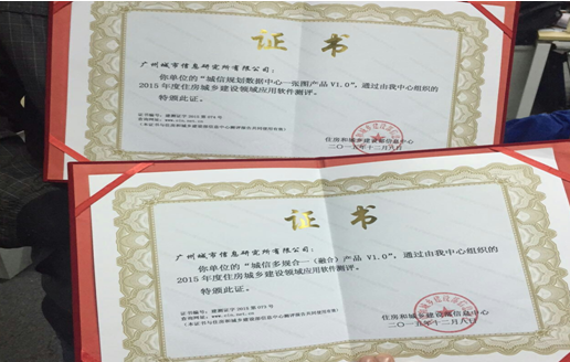2015年12月8日,广州城市信息研究所有限公司的两个产品——“城信多规合一产品V1.0”和“城信规划数据中心一张图产品V1.0” 顺利通过2015年度住房城乡建设领域应用软件评测。本次软件评测工作由住房和城乡建设部信息中心组织,旨在促进住房城乡建设领域应用软件产业化,提高应用软件水平,规划应用软件市场,为引导应用软件产品的发展方向起到积极的推动作用。